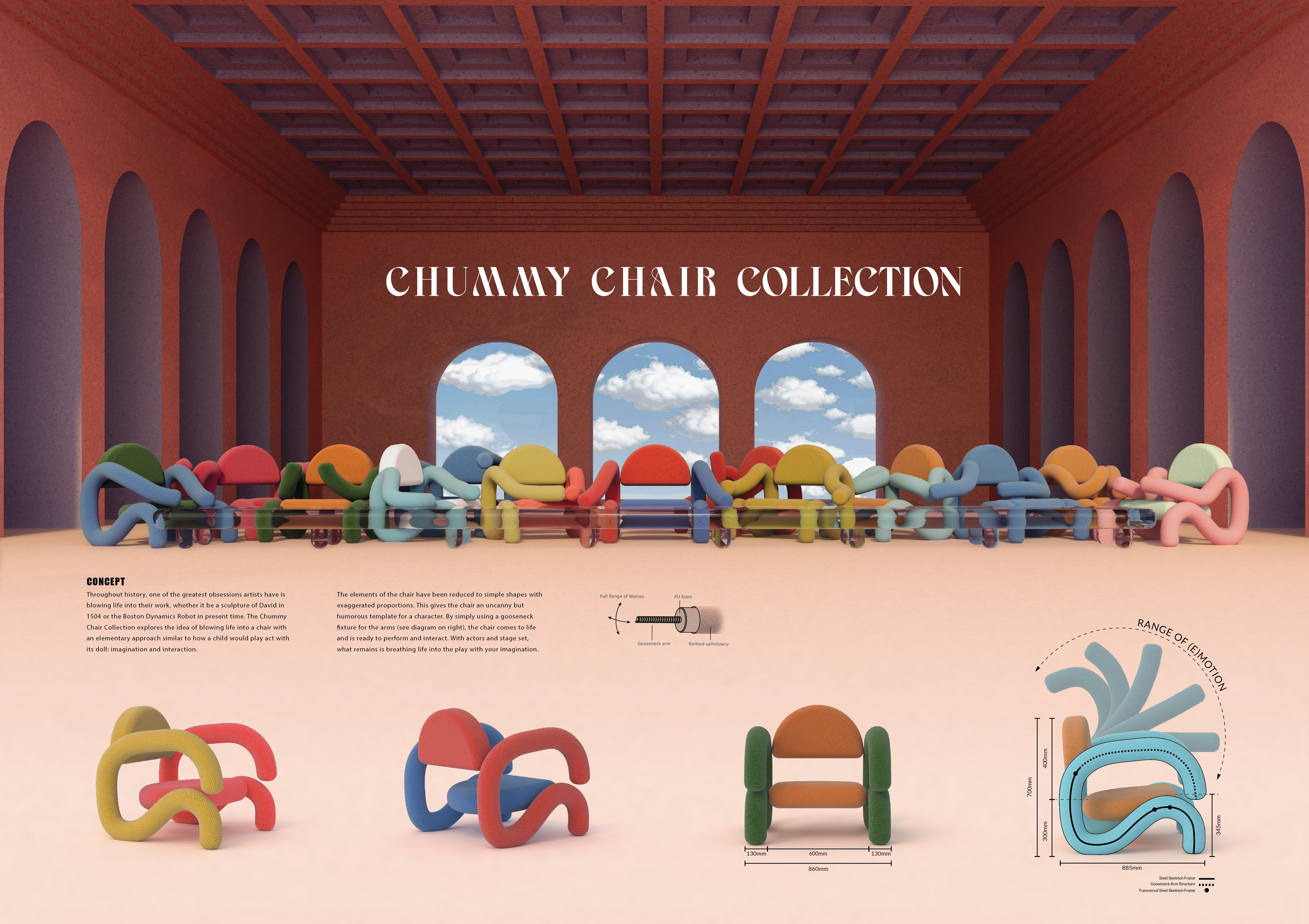 Throughout history, one of the greatest obsessions artists have is blowing life into their work, whether it be a sculpture of David in 1504 or the Boston Dynamics Robot in present time. The Chummy Chair Collection explores the idea of blowing life into a chair with an elementary approach similar to how a child would play act with its doll: imagination and interaction.