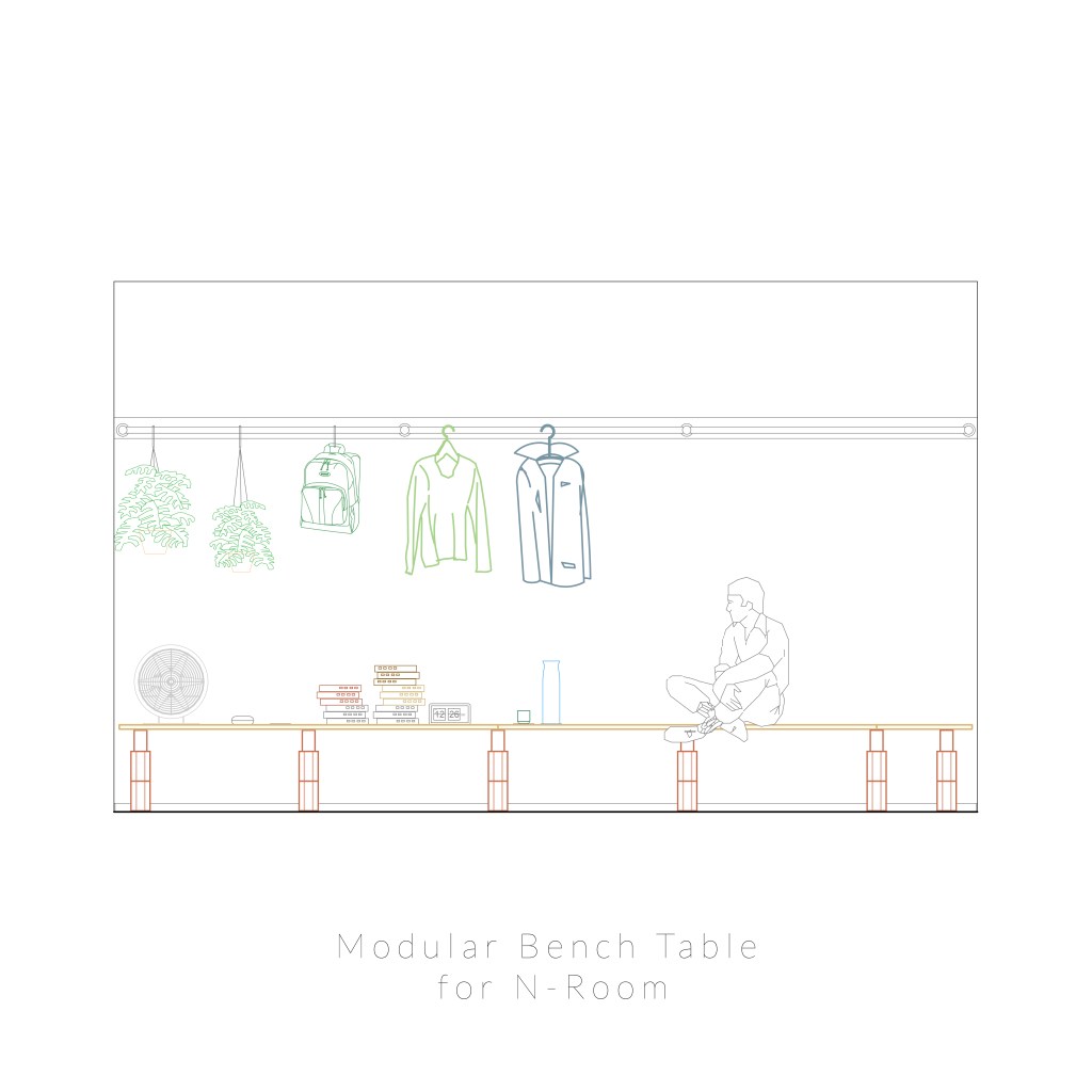The design of the bench table fulfils the purpose of switching between individual use and social gatherings. A simple item which could be used flexibly depending on the situation of the room yet be simple in aesthetics. When used in individual setting the bench emphasizes the full length of the room and keep the personal items on a lower plane which keeps the space simple and large. Furthermore the use of materials have been kept very simple with terracotta colored bricks and varnished wooden planks to keep the space grounded and functional.